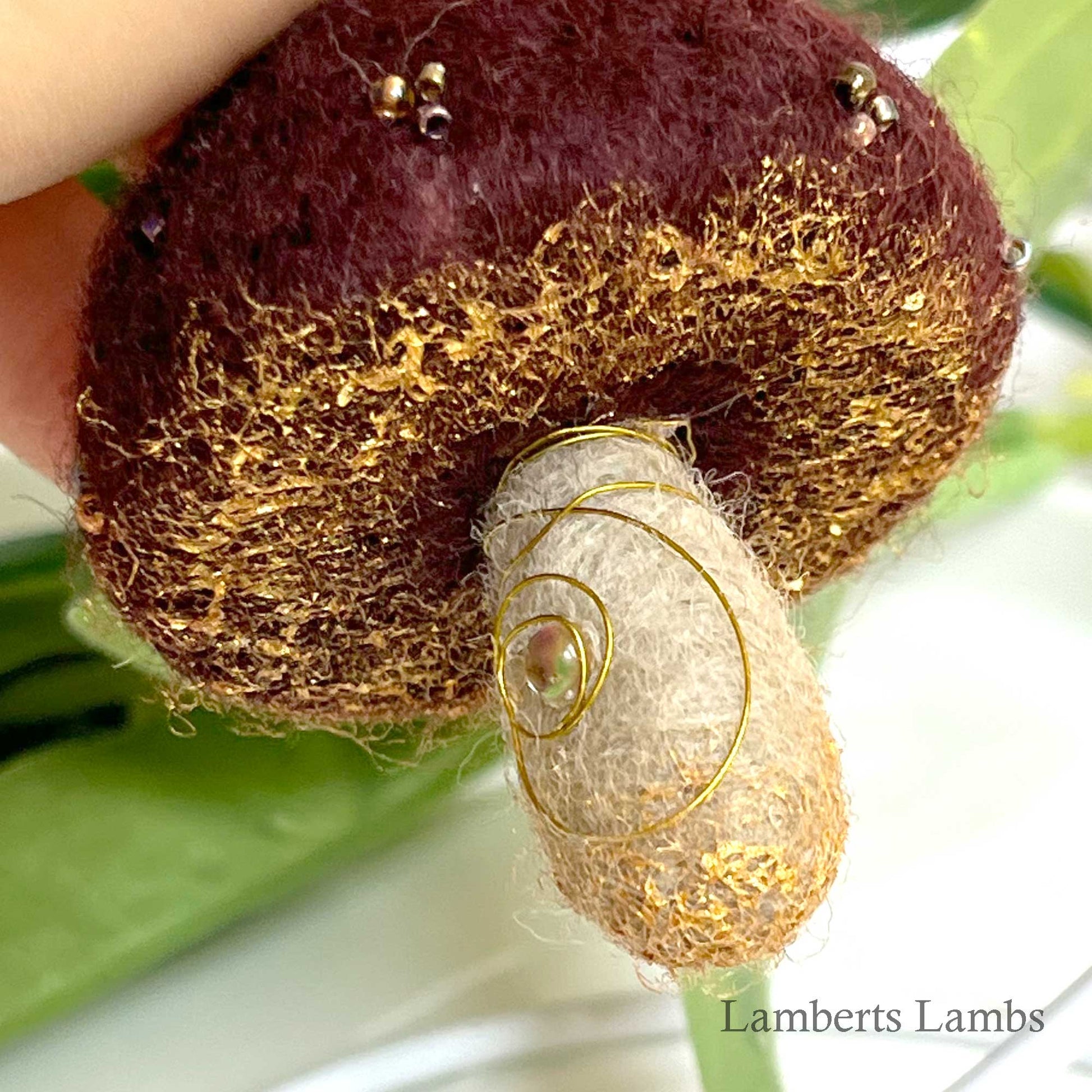 This needle felted mushroom hanging on a gold cord. The mushroom cap is made of brown wool, with glass beads of shades of brown-copper and the beige- brown stem has a golden wire wrapped around it end with it twirling around a little clear shiny resin stone. The underneath of the mushroom cap is highlighted with gold paint.