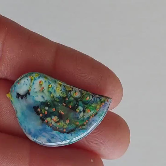 This bird brooch is hand drawn and colored initially on my pc using a digital stylus, and then once printed on shrink plastic, it is cut out and cooked (shrunk), then coloured some more by hand with alcohol markers, color pencils and some paint to achieve a vibrant design. Once the colours are set the jewelry is then hardened with UV resin.