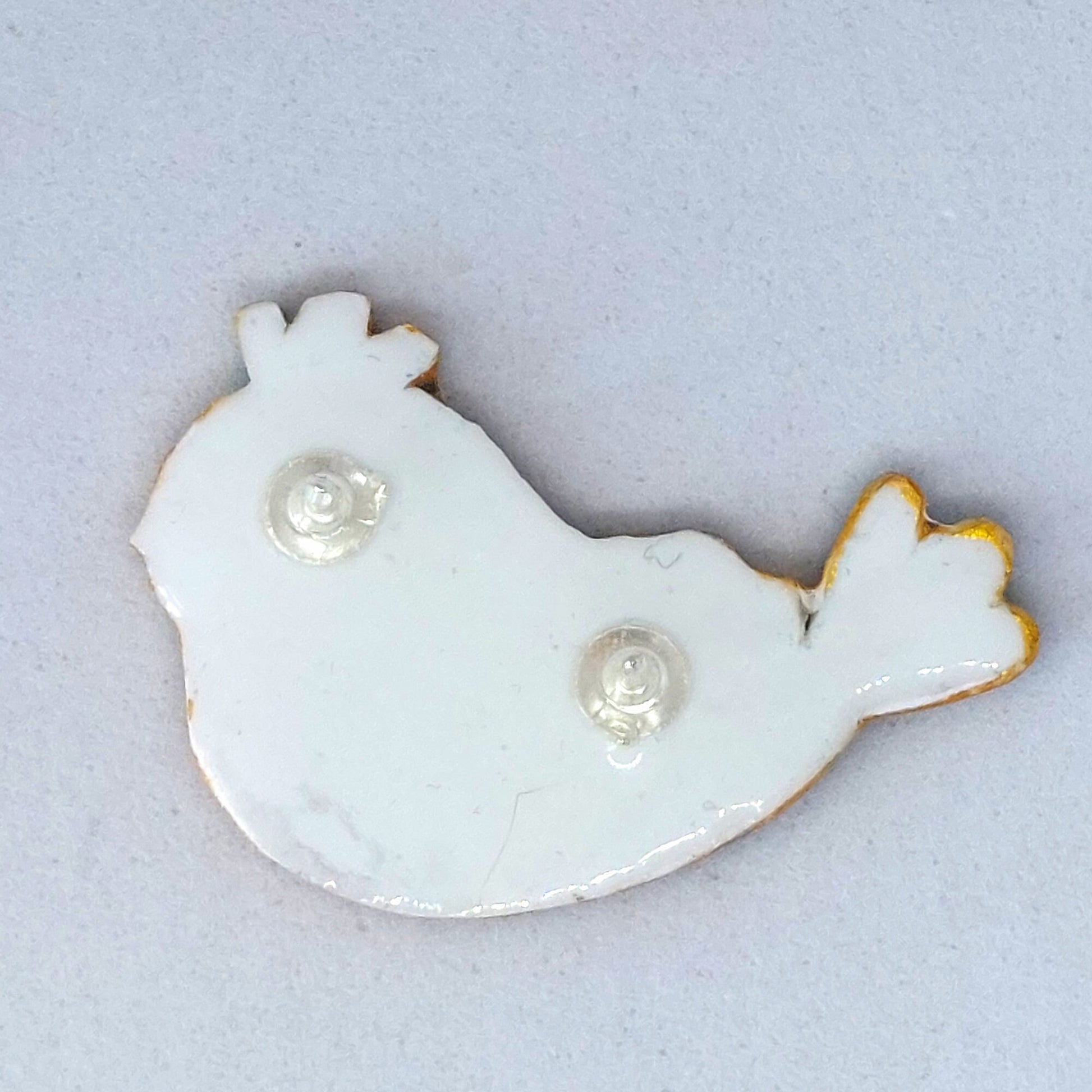A handmade and colored ceramic looking bird pin made from shrink plastic.