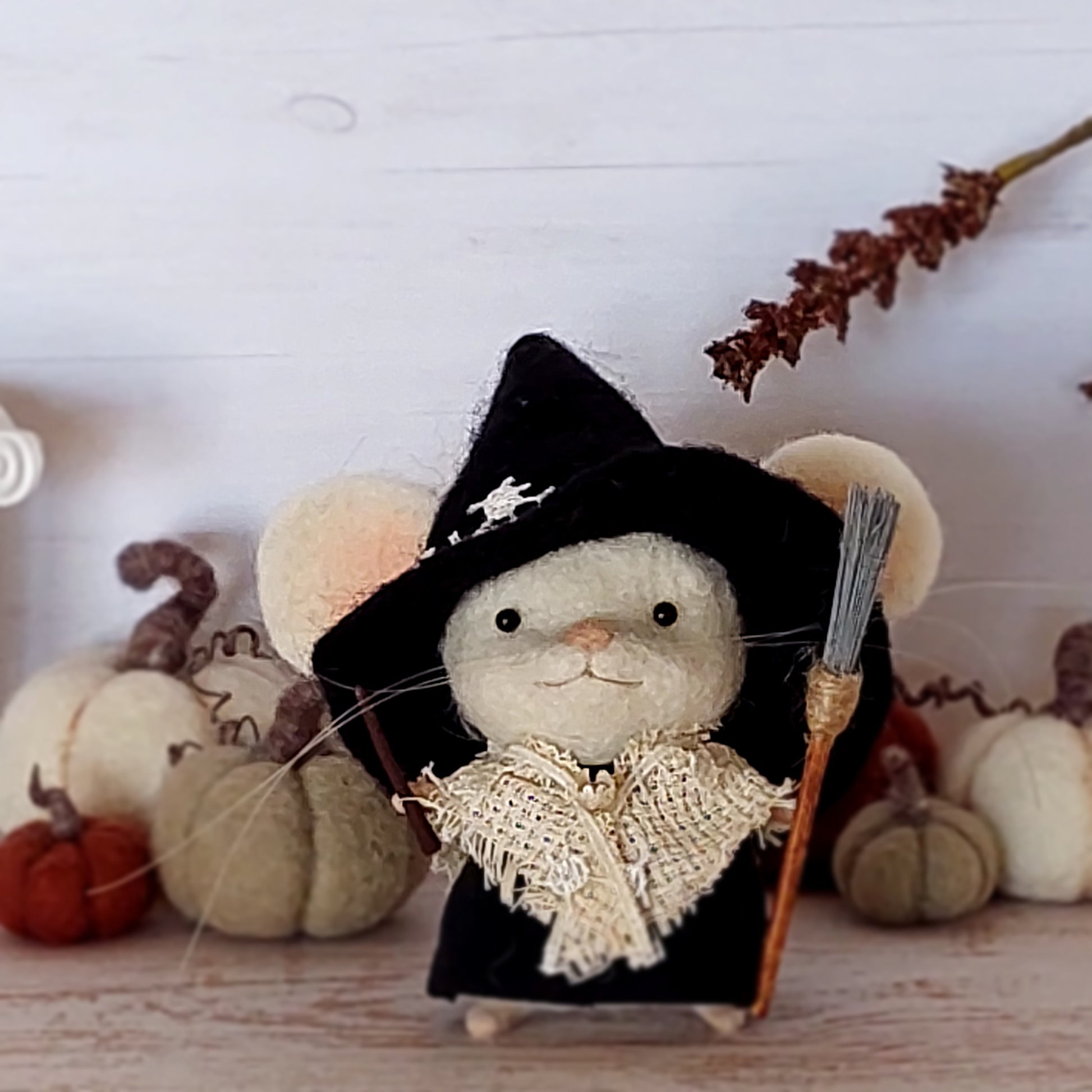 This is a one of a kind handmade needle felted mouse. She is made of wool and had a light wire armature. She is about 3.5 inches (8.8cm) tall and with her hat 4.25 inches (10.8cm) .